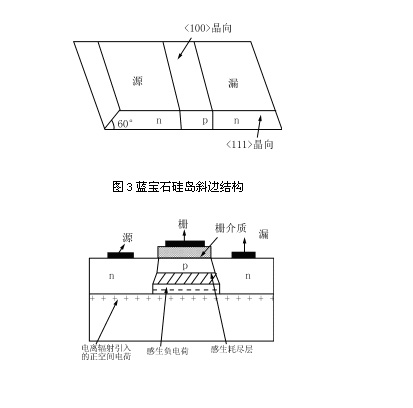 CMOS/SOS电路,电离辐射时在蓝宝石与硅界面附近的蓝宝石一侧表面上会形成正空间电荷,此电荷会使硅岛的p外延层上产生负的感生电荷,它可在源极和漏极之间形成另一条通路,使漏电流大大增加。背沟漏电流产生的结构机理如图4所示。