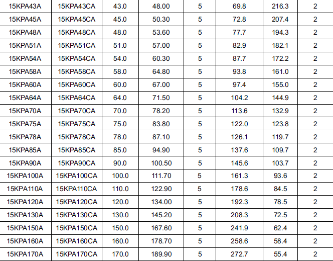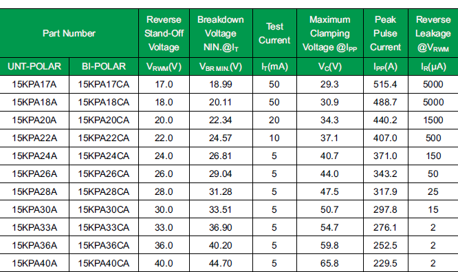 器件封装多样话有SMAJ,SMBJ,SMCJ,SMDJ,P4KE,SA,P6KE,1.5KE,3KP,5KP,15KPA,20KPA,30KPA系列和低电容的SAC(500W,50Pf),LCE(1.5KW,100Pf)系列。